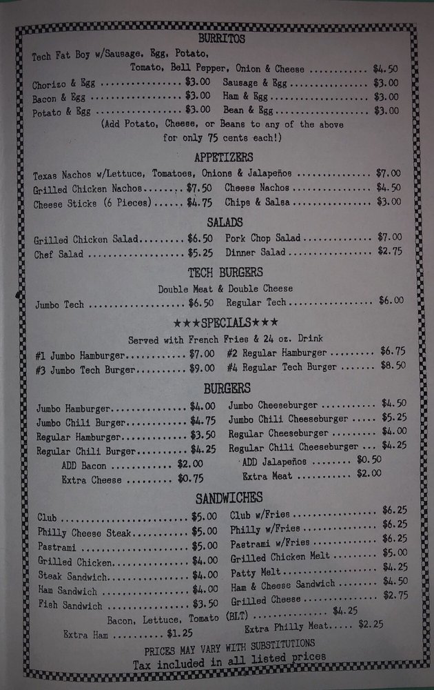 Welcome to Tech Cafe, a hidden gem located at 11703 University Ave, Lubbock, TX. This unclaimed café captures the essence of comfort with its delicious breakfast menu and free Wi-Fi, making it a perfect spot for students and locals alike. The menu features enticing options, such as the hearty Breakfast Ranchero with eggs, hash browns, and tortillas for just $7.00, or the savory Chorizo Breakfast at $6.75.